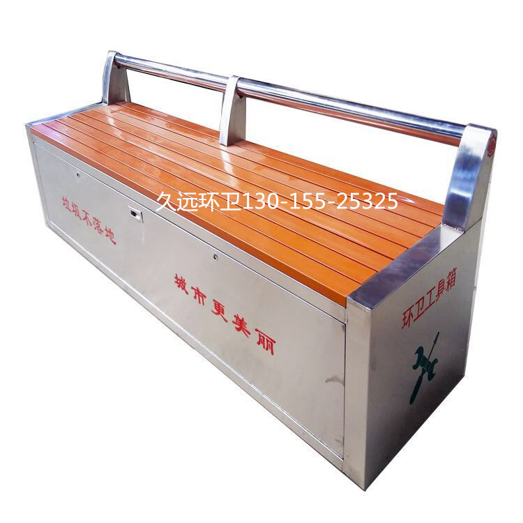 環(huán)衛(wèi)工具箱:也叫保潔員工具箱,環(huán)衛(wèi)工具椅,保潔員休息座椅,市政保潔箱等。工具箱常用尺寸為:長2400*寬500*高550mm,也可以做成2米,2.4米,2.7米等,寬度和高度也可以定做,滿足不同客戶、不同場所的使用要求。